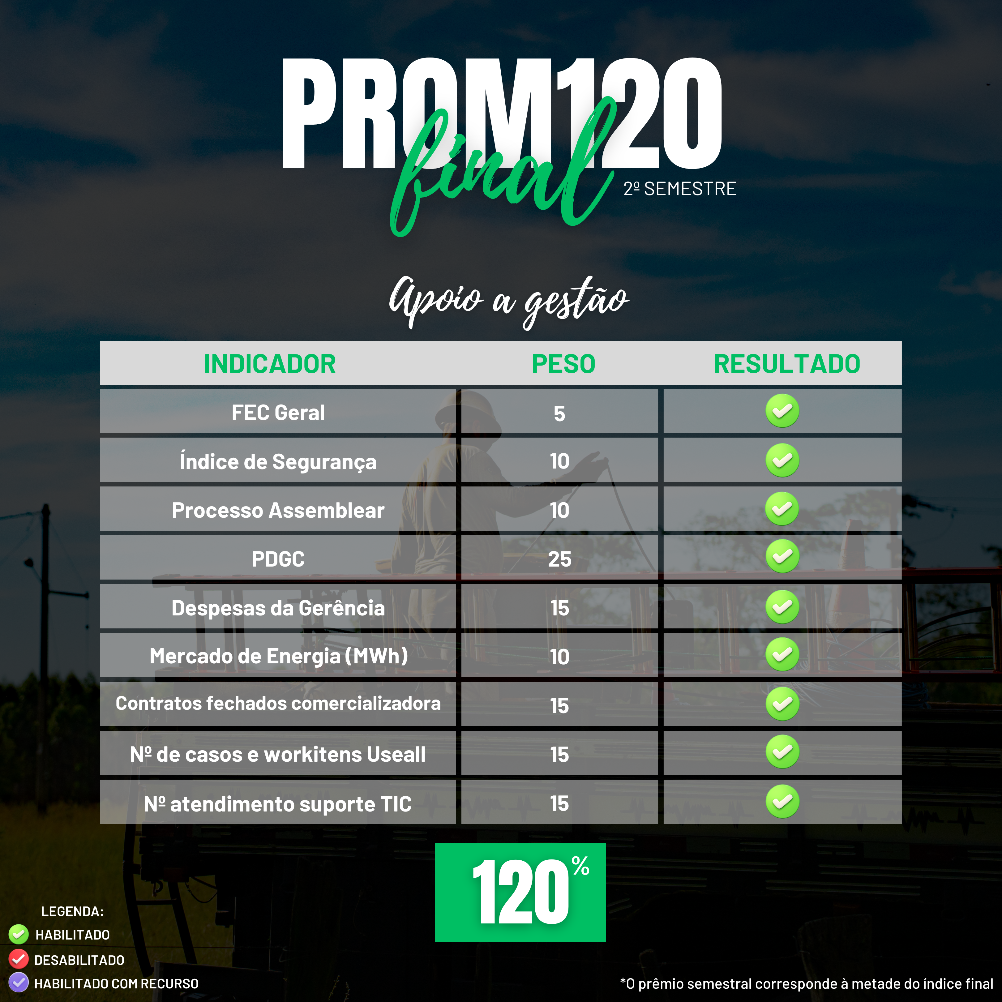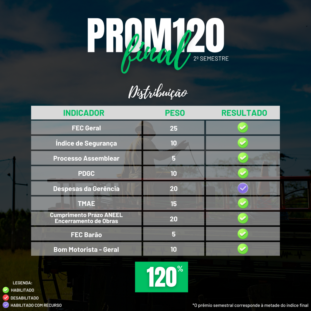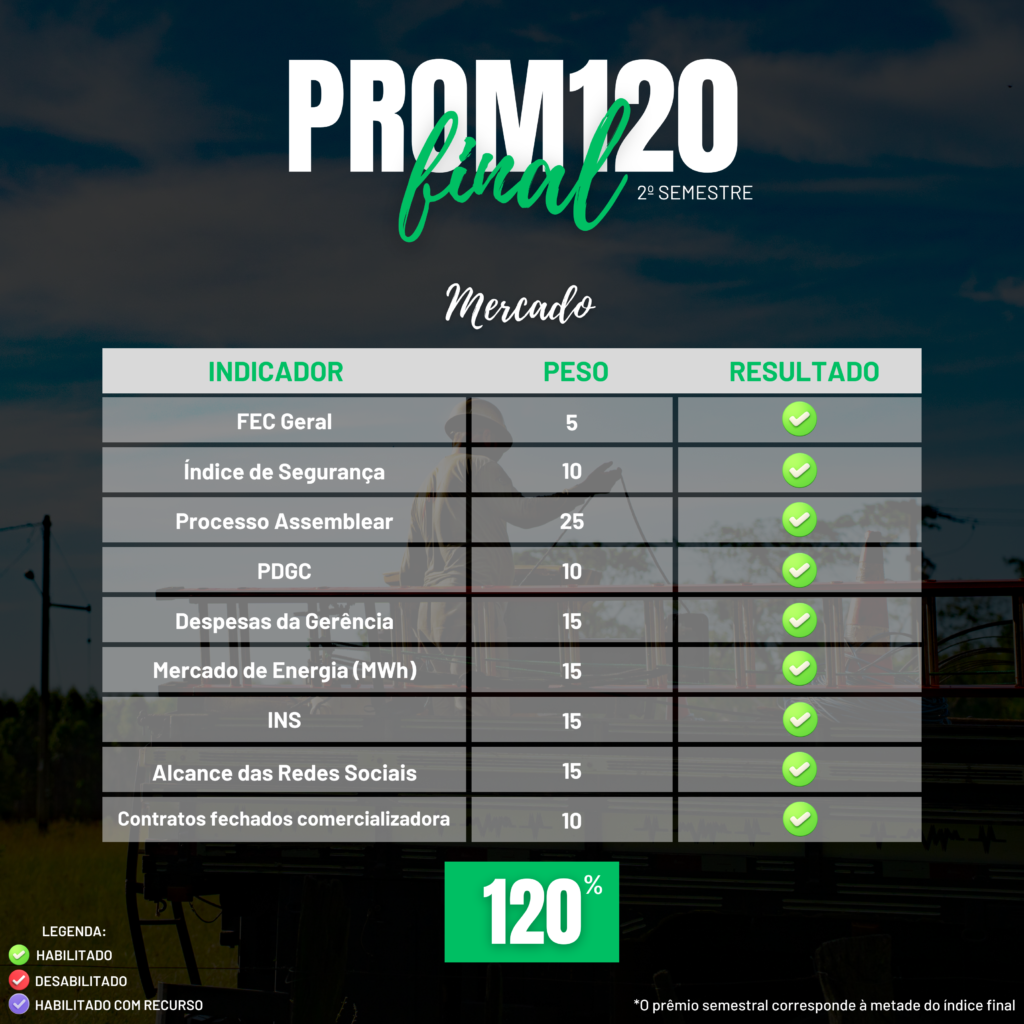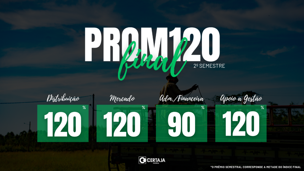 Ao todo, o ProM120 de 2025 foi composto por 21 indicadores diferentes. No segundo semestre, a CERTAJA Energia alcançou, com êxito, 19 desses indicadores, refletindo o esforço coletivo, o comprometimento das equipes e a consistência da gestão nos diferentes níveis da organização.