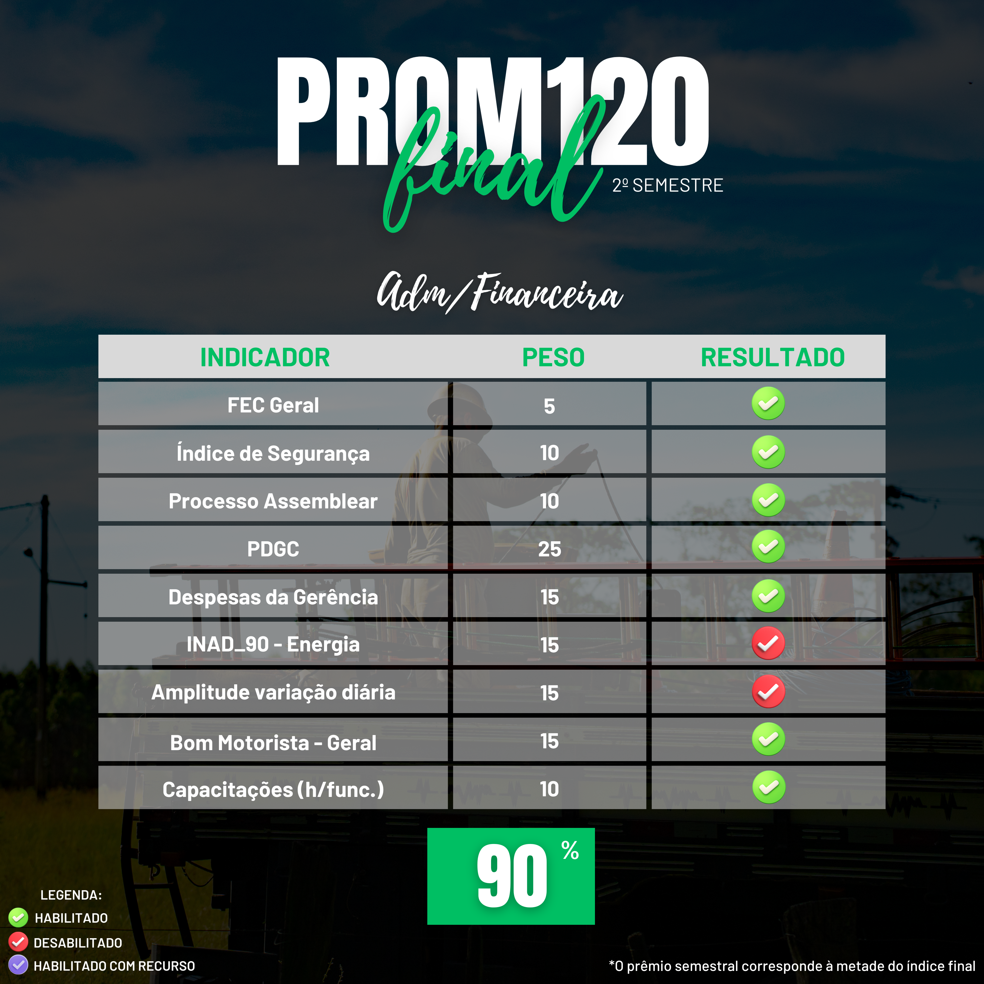 O pagamento referente ao ProM120 do 2º semestre de 2025 será realizado no dia 20 de janeiro. O valor do prêmio semestral corresponde à metade do índice final de cada gerência.