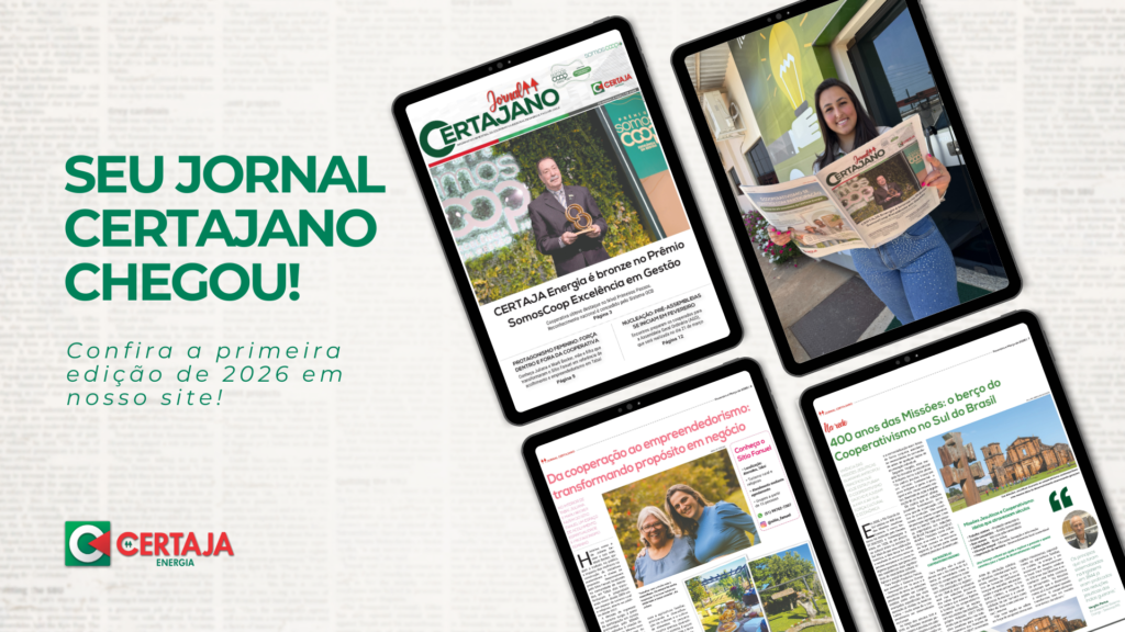 A nova edição do jornal Certajano começou a ser distribuída aos cooperados no dia 02 de fevereiro. O informativo traz como destaque a conquista do Bronze, pela CERTAJA Energia, no nível Primeiros Passos do Prêmio SomosCoop Excelência em Gestão, concedido pelo Sistema OCB.