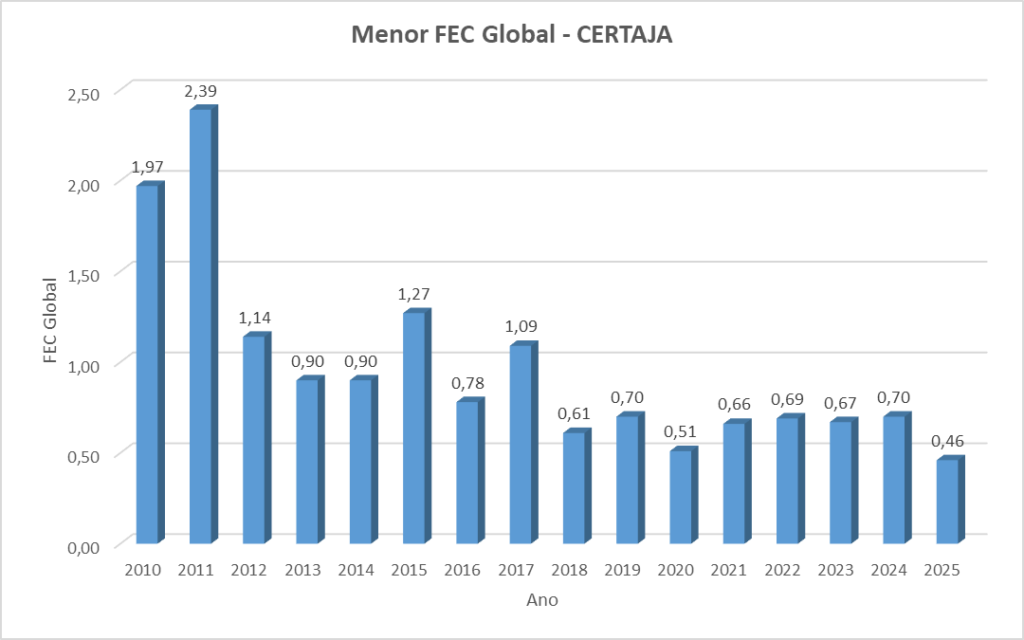 A CERTAJA Energia registrou, em junho, um dos melhores resultados de sua história no indicador de Frequência Equivalente de Interrupção por Unidade Consumidora (FEC) Não Programado. O índice de 0,35 vezes é o melhor desde 2009. Além disso, o FEC Global (que considera desligamentos programados e não programados) também se destacou, alcançando 0,46 vezes, o melhor resultado dos últimos cinco anos.